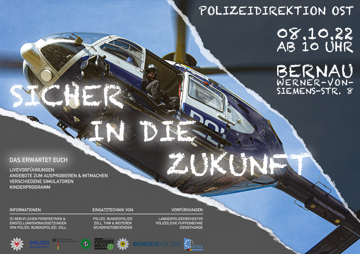 Am 08. Oktober 2022 veranstaltet die Polizeidirektion Ost in Bernau ihren "Tag der offenen Tür"! In der Zeit von 10:00 bis 16:00 Uhr findet die Veranstaltung am Standort der Polizeiinspektion Barnim in der Werner-von-Siemens-Straße 8 statt. Für alle Besucherinnen und Besucher haben wir unter der Überschrift „Sicher in die Zukunft“ ein spannendes und abwechslungsreiches Programm vorbereitet und möchten jedem, der sich für die Polizei interessiert, Einblicke in unsere Arbeit gewähren. Sie werden sehen, wie vielfältig der Beruf ist! So wird u.a. das Polizeirevier seine Pforten öffnen und Kriminalisten lassen sich bei einer Tatortuntersuchung über die Schulter blicken. Diensthunde zeigen ihr Können und auch der Polizeihubschrauber soll einschweben. Selbstredend wartet die Puppenbühne auf ihre kleinen und großen Zuschauer. Die Combo des Polizeiorchesters stimmt bereits die Instrumente und der Werbe- und Auswahldienst der Hochschule der Polizei des Landes Brandenburg wird mit den Einstellungsberatern über berufliche Perspektiven sowie über Einstellungsvoraussetzungen informieren.