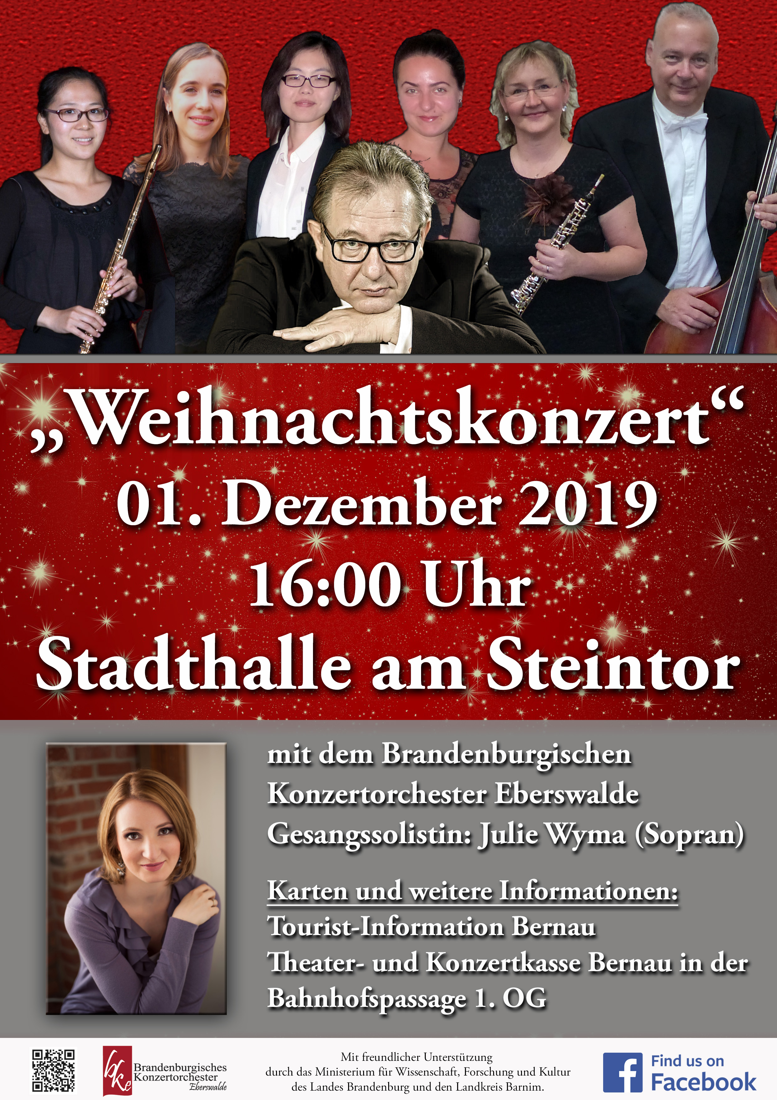„Weihnachtskonzert“ am 01. Dezember 2019 um 16.00 Uhr in der Stadthalle am Steintor in Bernau Zum 1. Advent erklingt am Sonntag, den 01. Dezember um 16.00 Uhr in der Stadthalle am Steintor in Bernau das stimmungsvolle „Weihnachtskonzert“ des Brandenburgischen Konzertorchesters Eberswalde. Bevor die weihnachtliche Anspannung um die Geschenke, das Essen und die Familienharmonie ausbricht, wollen die Musiker mit ihrer Solistin Julie Wyma (Sopran) den musikalischen Gabentisch reich decken. Mit den schönsten Weihnachtsliedern und einer Vielzahl beschwingter Weisen zum Advent ist weihnachtliche Vorfreude und Festtagsstimmung garantiert - eine entspannende und eindrucksvolle Gelegenheit, sich dem Geheimnis von Weihnachten singend, lauschend, schmunzelnd und nachdenklich zu nähern. Mit einer kurzweiligen Mischung aus traditionellen Weihnachtsliedern wie „In dulci jubilo“ und „Süßer die Glocken nie klingen“ sowie musikalischen Evergreens wie „Petersburger Schlittenfahrt“ und „Die Schlittschuhläufer“ möchten die Künstler ihr Publikum unterhalten und auf die schönste Zeit des Jahres einstimmen. - Änderungen vorbehalten - Karten und Informationen unter: Tourist-Information Bernau Tel. (0 33 38) 76 19 19* Theater- & Konzertkasse Bahnhofspassage 1. OG Bernau Frau Frost Tel. (0 33 38) 75 06 24* Brandenburgisches Konzertorchester Eberswalde Tel. (0 33 34) 25 65 0 Ticketportal: www.reservix.de Eintritt: 15,00 Euro VVK* / 18,00 Euro Tageskasse (*zzgl. VVK-Gebühr)
